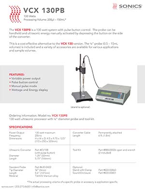 SONICS ultrasonic probe sonicator,VCX 130PB:Features a thumb pulse generator or foot switch for safe handling of various organic and inorganic materials, from 150 microliters to 150 milliliters. Typical applications include biotechnology and pharmaceutical processing, including mixing, dispersion and sample preparation uses.