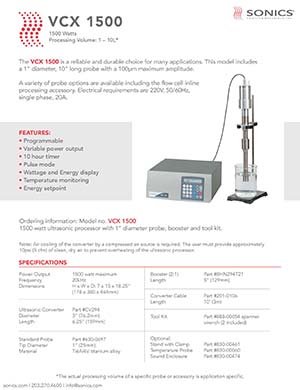 VCX 1500HV Industrial Ultra Sonicator,1500W ultrasonic processor and large capacity continuous flow cell with typical production rate of 100 liters/hour - variables are viscosity and degree of processing required. Mainly used for industrial mixing, including large-scale processing of nanomaterials; industrial processing, including emulsification, degassing and large-scale dispersion. The flow cell is easily disassembled for inspection and cleaning, and is water jacketed to allow samples to be cooled/heated as they are processed.