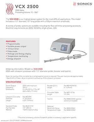 SONICS ultrasonic Homogenization VCX 2500:Air-cooled converter, capable of batch processing up to 50 liters* Typical applications include industrial mixing (including large-scale processing of nanomaterials) and industrial processing (including emulsification, degassing and large-scale dispersion systems).